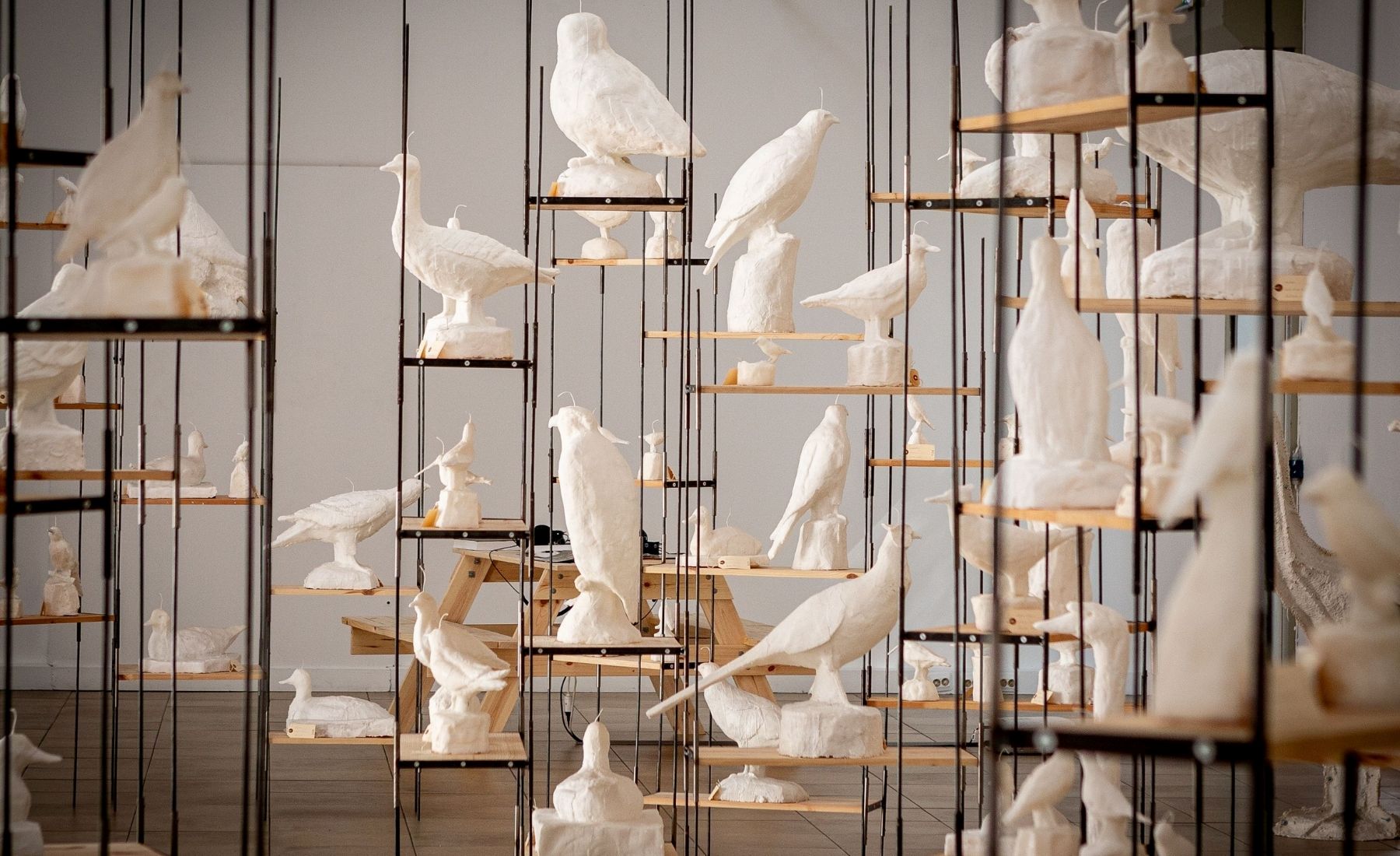 I utställningen visas även gjutformarna och fågelmallarna i obränd lera, som i sitt pågående sönderfall vidare påminner om förgängligheten, i kontrast till de solida och tomma gjutformarna. Samspelet i installationen, som svävar mellan skönhet och förgänglighet, framhäver det unika i situationen av att få stå mitt bland alla Sveriges fåglar i blek och stilla skepnad och njuta av deras mångfald och tillika den mångfald av tankar, som Fredrik Strid bjuder in oss att ta del av.
